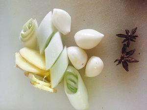 姜3片,葱2根,盐,黄酒。把红烧肉放在水里煮10分钟