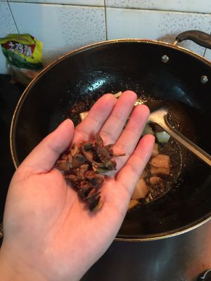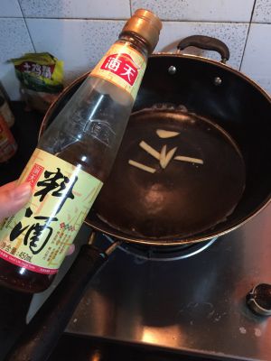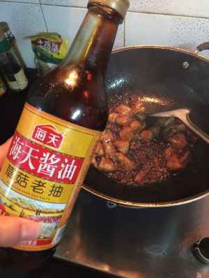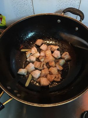 中火迅速翻炒,上色,加入适量酱油,继续翻炒,加入姜片。倒入热水。