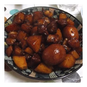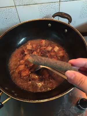 因已经放老抽,腐乳,就不用放盐了,如果觉得淡可以少放一点,大火收汁,ok,可以出锅了。因为老公不爱吃的肥的,就用后丘肉做的,实际上还是觉得五花肉更好吃。