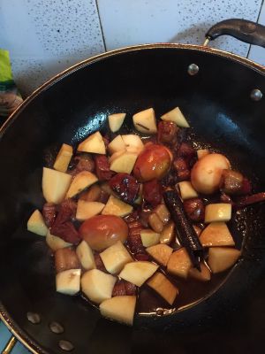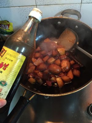 放入土豆,适量老抽,生抽(提味)大火翻炒。