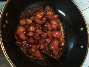 一次放入,料酒,酱油,白糖。我五克勺,(三勺料酒,五勺酱油,八勺糖)。用大火煮收汁,最后出锅的时候放一勺盐,一勺鸡精。我还放了一点自己泡的柠檬醋,柠檬醋回头给大家献上!
