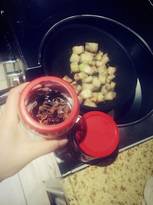 再倒入水,差不多漫过肉就可以,将大火调至中火,水开始冒泡的时侯,可以加五香粉了,量随自己喜好定,也有人不用五香粉,用香料也OK。可以根据自己的喜好调味,我一般会再加一些盐,味精和糖。待水变粘稠了,可以加一些些的白酒,然后调至大火收水,这个过程要不断翻炒,防止受热不均,有的肉肉烧焦了