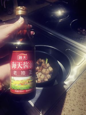 把准备好的葱姜蒜,八角倒进去炒几下,然后倒适量的生抽,老抽,料酒。