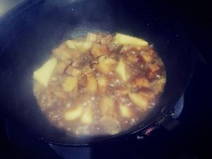 电压力锅好了后倒回炒锅,加入刚掰好的土豆翻炒一下然后炖熟