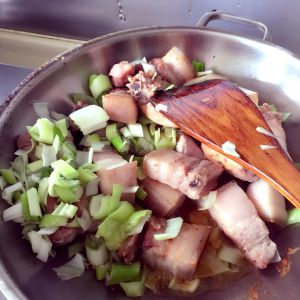锅中放少许油,放入五花肉翻炒,倒入料酒翻炒放入葱末翻炒。