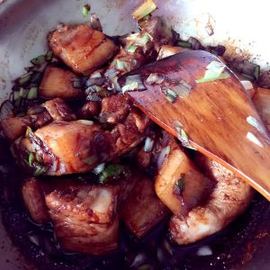 待五花肉表面稍显焦黄时加水(没过五花肉表面),煮沸后加入老抽,生抽。