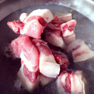 锅里加水、放入姜片黄酒、把肉放在水里一起煮沸、捞出洗干净、切小块!