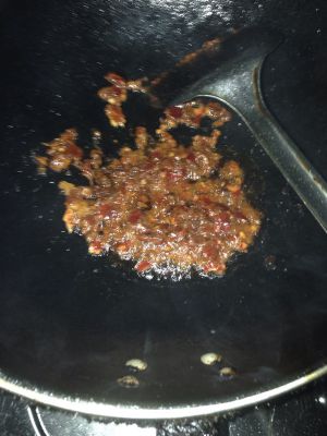 锅里倒入适量油,油热时放入郫县豆瓣翻炒至出香味。