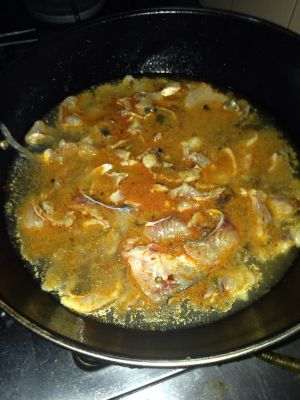 少量油爆锅,放入鱼刺,鱼头,颜色微变,加入高于鱼身的水,可以放入微量的盐,过程中,将鱼沫沫,用汤勺撇出来,30分钟后,盛出来备用。