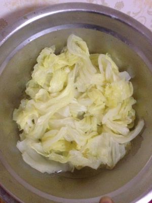 腌渍过程中,把白菜取叶,手撕成小块放入开水焯熟(最好是豆芽),然后铺在碗底。