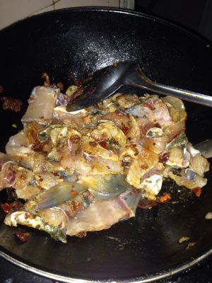 把鱼片和鱼骨倒入锅内翻炒片刻,加入适量水(没过鱼片)。