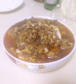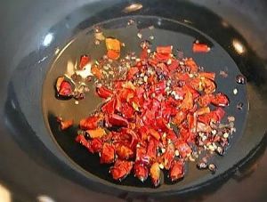 倒入盛有豆芽的盆中,炒锅放油,要比平时炒菜多1.5倍,凉油放入花椒大料小火烧,至油冒轻微的烟放入干红辣椒,炸至颜色变成橘红关火,次啦倒在鱼片上。好了,来碗米饭!!!