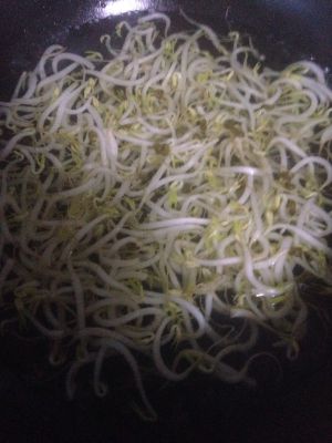 把豆芽和菠菜炒熟后铺在碗底,备用。。