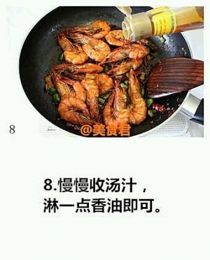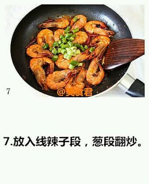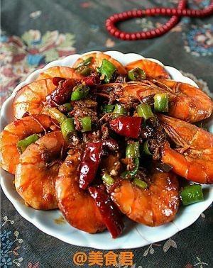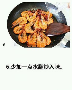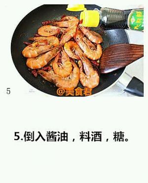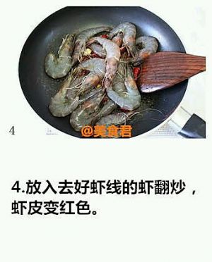 二、开炒: 1.冷锅下油,可以稍微多点,放麻椒,开小火,慢慢炒出麻椒的香味,放入干辣椒煸一下,颜色变红即可 2.火调大一点,放入葱姜蒜煸炒出香 3.下大虾,要沥好水,小心挨崩! 4.疯狂的炒它,火候自己掌握一下,喜欢干巴的就多炒一阵,喜欢嫩的就轻点炒着,标准是把虾炒制中出的水炒没 (炒干巴的注意点,虾刚进锅火大点,炒差不多就转中小火,慢慢炒干,可别一直大火猛攻给虾跟料都炒糊了)