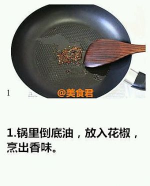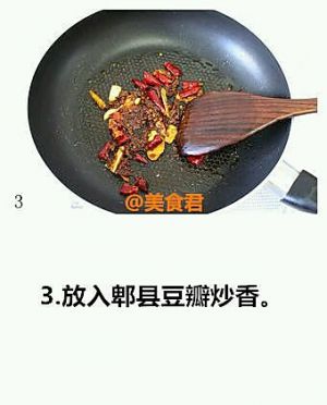 香味出来后,放2勺豆瓣酱、1勺干花椒和适量干辣椒,慢慢炒出红油来。注意一定要用小火慢慢炒,红油才炒得亮。