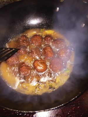 锅里放蚝油酱油料酒和少量水,放入之前的炸好的肉丸,煮至收汁
