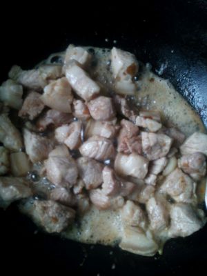 待冰糖溶化后,放入五花肉,炒糖色;