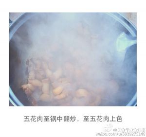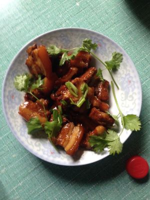 然后起锅放油,放五块冰糖,放葱姜蒜,放肉,炒起来,在放生抽老抽耗油,盐,料酒,炒起来,在放水,煮一会,收汁,好了啊
