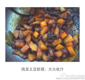 小火焖烧三十分钟,若准备有土豆此时可放进土豆丁,炖至土豆软糯,大火收汁