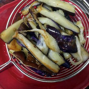 炸好的茄子(当然不想浪费油的可以用另外一个方法就是切好的茄子加盐腌制挤干水备用)