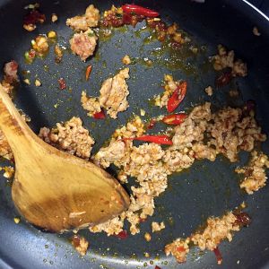 起油锅下姜蒜末和指天椒爆香,在加入一勺郫县豆瓣酱炒出红油(整个关键)
