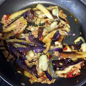 下处理好的茄子煸炒,加入蚝油,糖,酱油翻炒均匀。