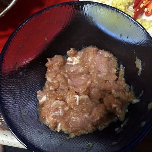 猪肉剁碎,加入盐,生粉,酱油,食用油,料酒腌制备用。