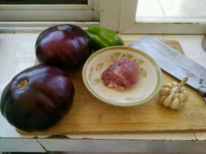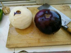把茄子和辣椒放在火上烧。辣椒烧成图片上这样就够了,但茄子要整个都烧,直到可以把皮用手撕为止。(茄子手撕的时候不要冲水,冷了后撕。)
