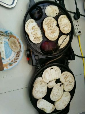 打好花刀的茄子下电饼铛,电饼铛预热抹薄油,