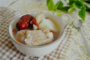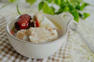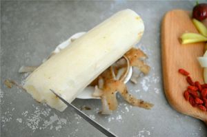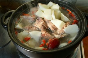 给山药切成任意形状,最好块儿大一点,跟排骨汤差不多(这我个就小了些,最后差点煮化了。。)