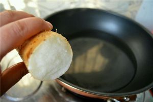 处理山药,如果你的锅子不够大,必须把山药截开才能放进去。那么可以试试在截面抹一层细盐,这样就不会因为氧化变的黑黑的。我会山药的外皮会过敏,所以我的方法是把山药带着皮清洗一下,然后放进锅里去煮。