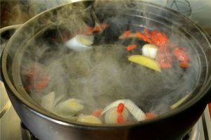 锅子放一锅水,加入葱姜枸杞红枣煮沸。