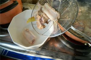 这时,锅里会有一层浮漂,我们把排骨块儿捞出来备用。