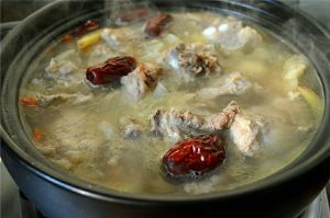 大火烧开开后烹料酒除腥, 转小火煮1小时, 放入花菇、玉米、胡萝卜烧滚后小火煮半小时,加盐和鸡精调味即可。