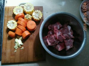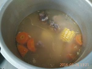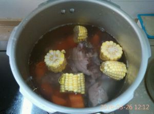 我用高压锅,比较快。将食材全倒入锅肉,盛5-6碗水,视料而定,有时我也会放两条玉米,两条红萝卜,7-8碗水。 (滴几滴花生油,较香,不用香油哦) 大火烧开后,继续大火10分钟,小火30-40分钟。