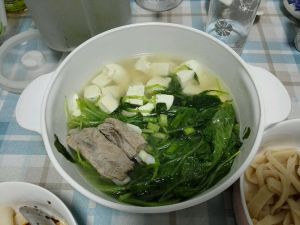 加入切块的南豆腐,开锅三分钟后。加入洗净的小白菜苗,烧开两分钟即可。