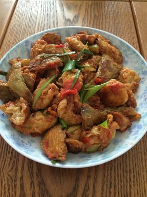 然后放茄子开始翻炒,要耐心把所有茄子都要沾油,然后炒到茄子变色,就可以放辣椒,盐和蒜。继续炒到茄子变软就放三分之一饭碗水,开闷。