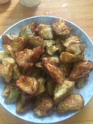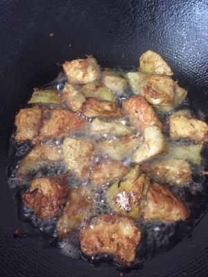 将茄子切成滚刀状,在盐水里泡十分钟,倒掉水分,裹上一层薄薄的淀粉,放锅里炸