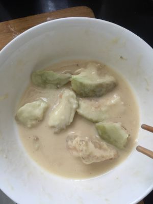 鸡蛋、面粉、适量水搅匀后放入茄子挂浆