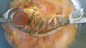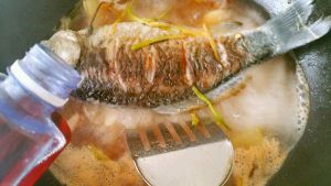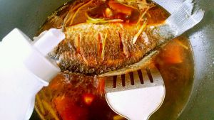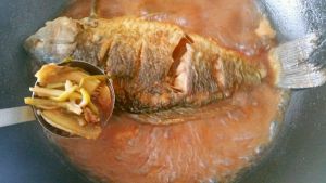 汤汁煮到一半时,用勺子捞出葱段和姜片不要,把鱼盛出装盘