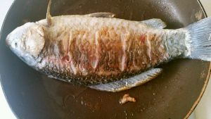 平底锅加入适量油,放入鲫鱼煎至两面金黄