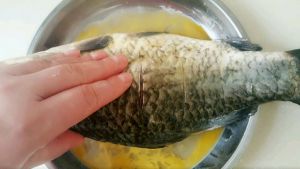 鲫鱼肚皮划三刀,倒适量料酒,两面抹上盐腌制15分钟。