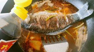 放入洋葱,蒜沫,生姜,倒入适量料酒,一勺老抽,一勺生抽,加水过鱼的3分之2,加入一勺豆鼓味老干妈,加入少量白糖,开中火煮至鱼汤剩1/3。