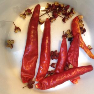 准备干辣椒和麻椒。根据个人吃辣的口味可调节多放些,味道会更香。