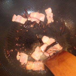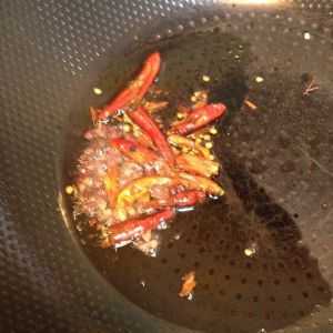 油锅先煸香麻椒和干辣椒。(干辣椒下锅前先掰成两掰)注意火别大啦,麻椒很容易糊。