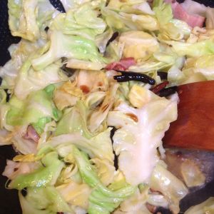锅倒入适量植物油烧热,放入姜丝爆香,然后倒入撕好的包菜大火翻炒,炒至八成熟时倒入调好的料汁和大蒜片继续翻炒,再加入少许盐(盐要把握好量,因为蚝油和味极鲜酱油都是有咸味的)。