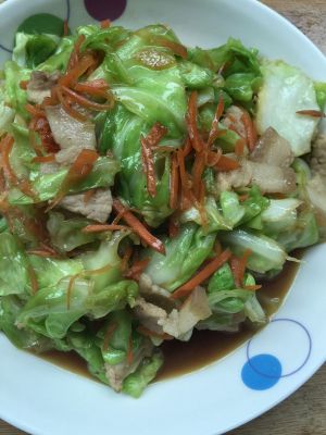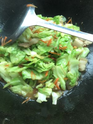 倒入撕好的包菜翻炒,炒至稍软时依次加入酱油,白醋,盐,鸡粉,翻炒均匀即可