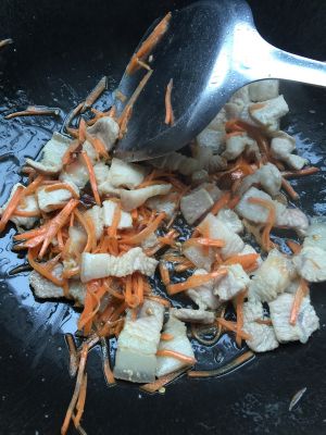 冷锅入油,锅微热放入腿肉煸炒一会儿,断生 放入朝天椒,待辣味出来,放入胡萝卜丝炒软