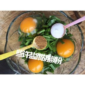 韭菜变色后放入鸡蛋加入盐,五香粉,翻炒出锅