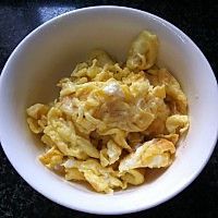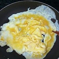 热锅放适量油,倒下鸡蛋保持大火煎制,鸡蛋皮未定型前用筷子快速划散。【鸡蛋别煎太老,影响口感。】